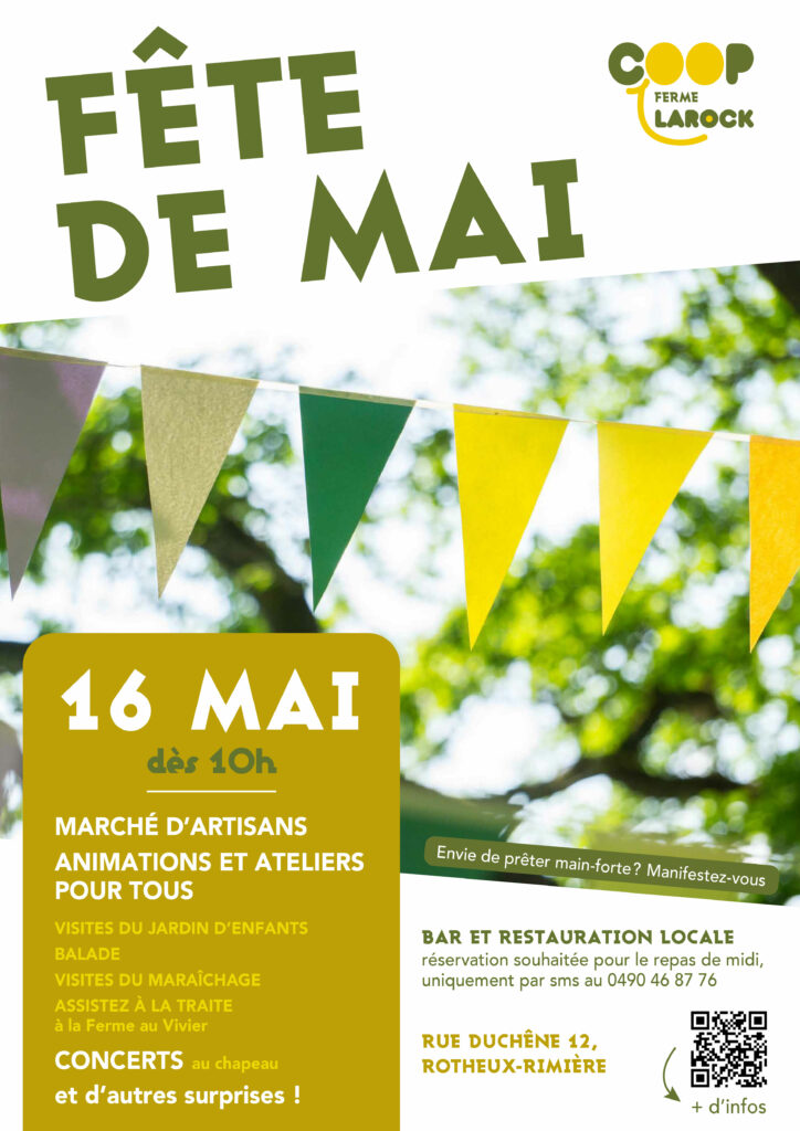 | Samedi 16 mai, La Ferme Larock vous ouvre ses portes ! Durant toute la journée: animations pour petits et grands, marché d’artisans, concerts, visite du Jardin d’Enfants, du maraichage et de la Ferme au Vivier (qui fabriquent vos fromages préférés). A 12h, assiette de produits locaux à savourer et bar local, rencontre avec vos producteurs et des assoc’ engagées. Ne manquez pas cette occasion de découvrir la ferme dans tout ses recoins, dans une ambiance festive et familiale. Pour le repas de midi, réservation souhaitée au 0490 46 87 76 uniquement par sms. Pour prêter main forte à l’organisation (avant, pendant ou après), manifestez-vous au même numéro ou au magasin. Merci d’avance de votre soutien. Au plaisir de fêter le renouveau avec vous ! | |